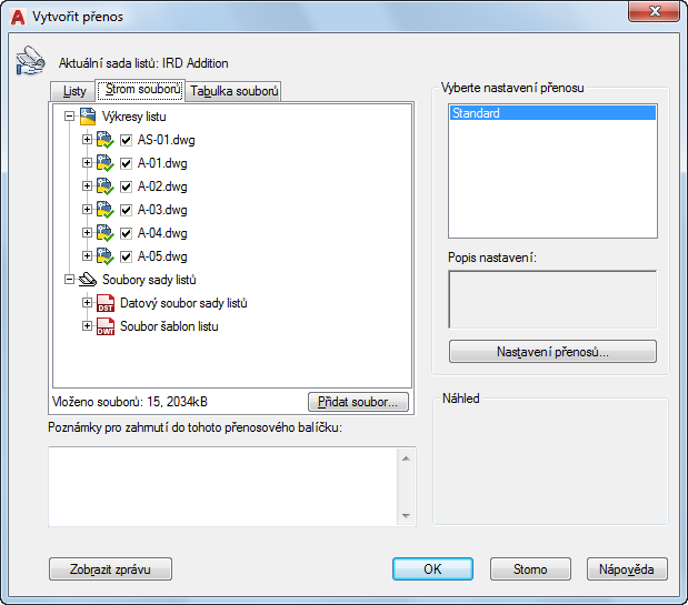 Implicitně jsou všechny soubory spojené s aktuálním výkresem (jako jsou externí reference, styly vykreslování a písma) uvedeny v seznamu. Do přenosu můžete přidat soubory nebo existující odstranit. Soubory, které jsou odkazovány prostřednictvím URL, nejsou do přenosu zahrnuty.