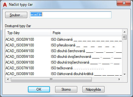 Zobrazí název aktuálního souboru s typy čar (LIN). Je možné zadat název jiného souboru LIN nebo pomocí tlačítka Soubor vybrat soubor v dialogu Vybrat soubor typu čáry.