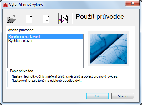 Nastaví výkres pomocí průvodce. Můžete si vybrat ze dvou průvodců: Rychlé nastavení a Rozšířené nastavení.