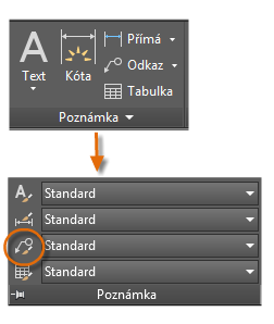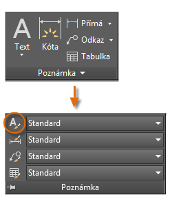 Stejně jako řada dalších funkcí poznámek, nabízí víceřádkový text mnoho možností nastavení. Tato nastavení můžete uložit pomocí příkazu PÍSMO jako styl textu. Přístup ke stylům textu, které jste uložili, pak můžete získat kliknutím na rozevírací šipku na panelu Poznámka. Aktuální styl textu je zobrazen v horní části rozevíracího seznamu.