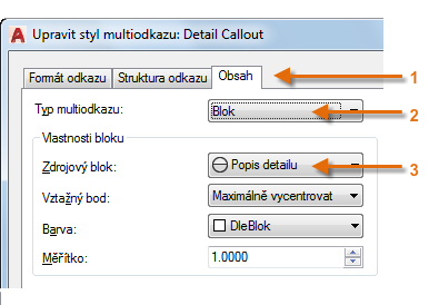 Chcete-li například vytvořit styl „odkaz na detail“, spusťte příkaz MODKAZSTYL. V dialogu Správce stylů multiodkazů klikněte na tlačítko Nový a zvolte popisný název nového stylu multiodkazu. Klikněte na kartu Obsah, vyberte položku Blok a potom položku Popis detailu, jak je znázorněno.