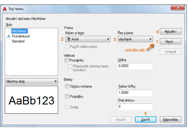 Při vytváření nového stylu textu zadejte jeho název a potom vyberte písmo a styl písma. Pořadí, v jakém klikáte na tlačítka, je uvedeno níže: