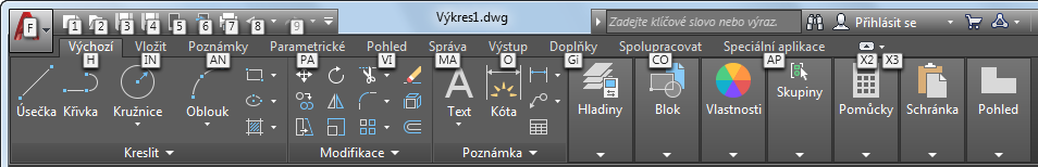 Pomocí klávesnice lze pracovat s nabídkou aplikace, panelem nástrojů Rychlý přístup a pásem karet.