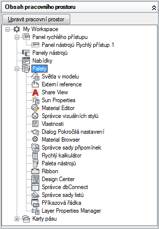 - V podokně Obsah pracovního prostoru klikněte na znaménko plus (+) vedle uzlu Palety. Položka se rozbalí.