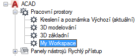 - Na kartě Vlastní v podokně Uživatelské úpravy: <název souboru> klikněte na znaménko plus (+) vedle uzlu Pracovní prostory. Tento uzel se rozbalí.