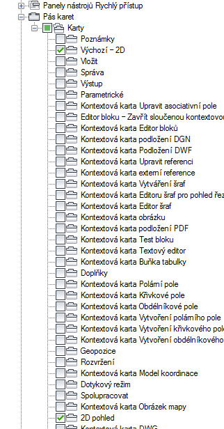 - Vyberte pracovní prostor s kartou pásu, na které chcete změnit vlastnosti panelů pásu karet.