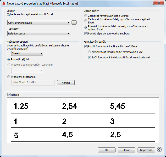 Spojí celý zadaný list aplikace Excel s tabulkou ve výkresu.