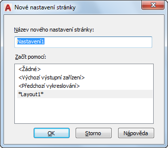 Určuje nastavení stránky, které bude použito pro zahájení tvorby nového nastavení stránky. Pokud kliknete na OK, zobrazí se dialog Nastavení stránky s nastaveními vybrané stránky, která můžete podle potřeby upravit.