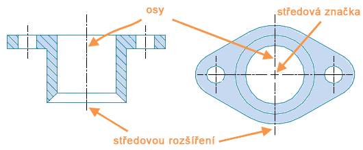 Aktualizace tématu: aktualizovány obrázky os. Středové značky a osy se používají jako referenční kóty ke středům děr a osám symetrie.
