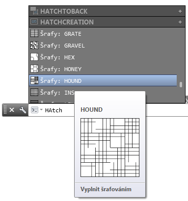 Vyberte název šrafy a kliknutím do uzavřené oblasti nebo objektu ve výkresu šrafu vložte.