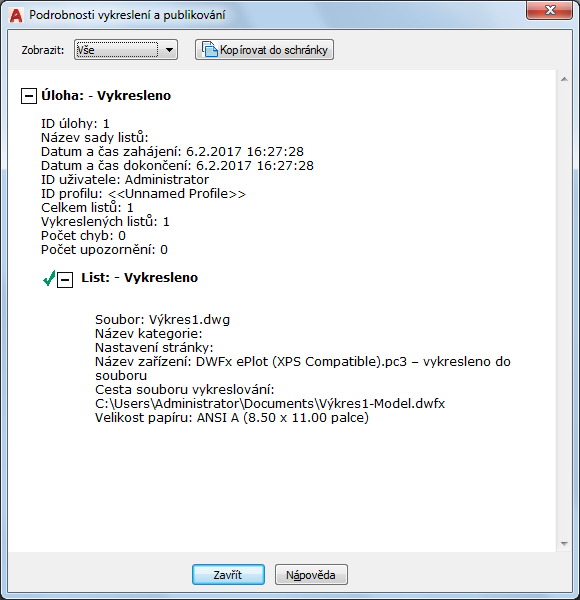Zobrazí informace o dokončených úlohách vykreslování a publikace a listech těchto úloh.