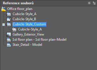 Horní úroveň stromového zobrazení zobrazuje vždy aktuální výkres. Soubory s referencemi se zobrazují na nižší úrovni. Soubory s referencemi, které obsahují vlastní vnořené referenční soubory, lze otevírat tak, aby se zobrazily nižší úrovně. Při provádění výběrů ve stromovém zobrazení nelze současně vybírat více než jeden referenční soubor.