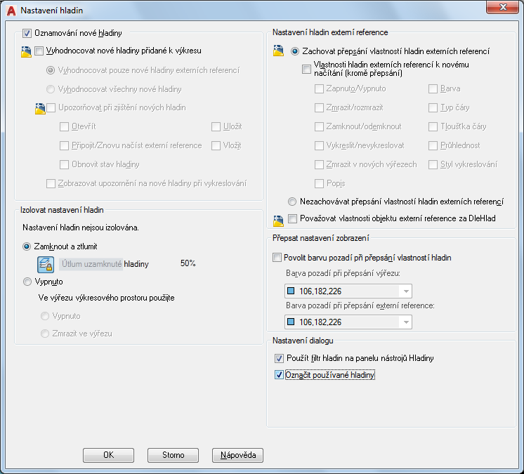 Řídí zobrazení přepsání vlastností hladiny externí reference v aktuálním výkresu.