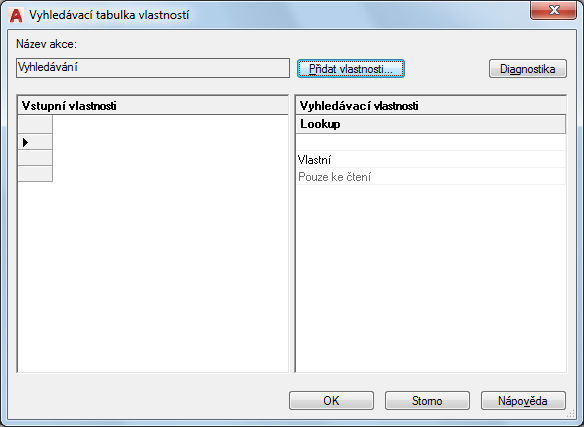 Vyhledávací tabulka přiřadí hodnoty uživatelských vlastností k referenci dynamického bloku. Pokud je pro vyhledávací vlastnost vybrána možnost Zpětné vyhledávání, reference bloku zobrazí vyhledávací uzel se seznamem vlastností, které mění zobrazení reference dynamického bloku.