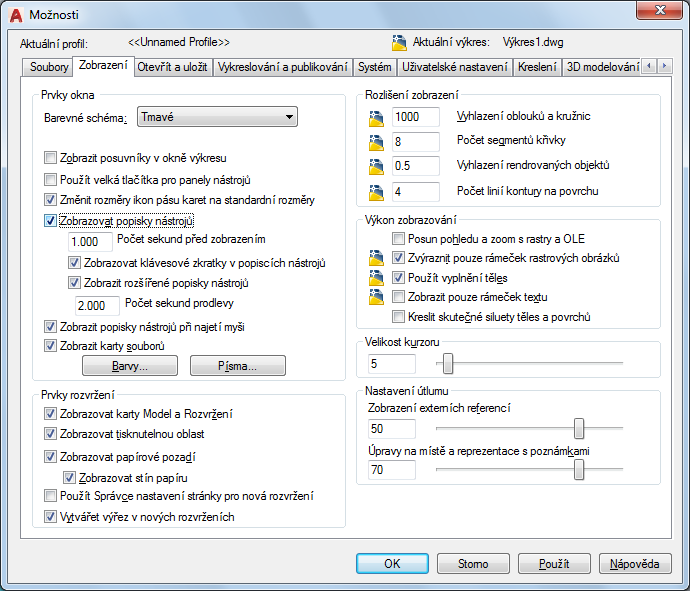 Řídí nastavení zobrazení specifické pro kreslicí prostředí.