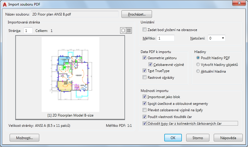 Vytvoří se hladiny aplikace AutoCAD z hladin uložených v souboru PDF a použijí se na importované objekty. Názvy hladin mají předponu PDF. Hladina objektu se vytvoří v případě, že se žádná hladina nenachází v souboru PDF.