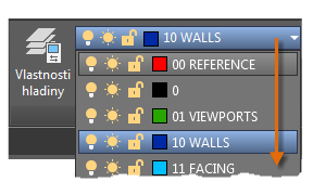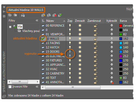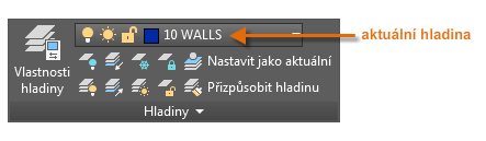 Jak je vidět na obrázku, hladina 10 STĚNY je aktuální hladina. Všechny nové objekty budou automaticky umístěny do této hladiny. V seznamu hladin zelené zaškrtnutí vedle hladiny 10 STĚNY potvrzuje, že se jedná o aktuální hladinu.