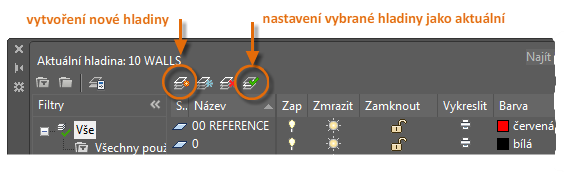 Chcete-li vytvořit novou hladinu, klikněte na zobrazené tlačítko a zadejte název nové hladiny. Pokud chcete nastavit jako aktuální jinou hladinu, klikněte na ni a potom klikněte na označené tlačítko.