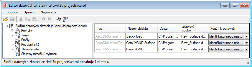 V editoru datových zkratek jsou v datovém stromu, umístěném na levé straně, zobrazeny všechny datové zkratky ve vybrané projektové složce. Chcete-li vybrat jinou složku, klikněte na položku nabídky Soubor