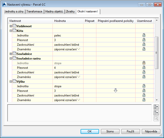 Na kartě Okolní nastavení je ve sloupci Přepsání podřízeného zobrazena šipka vedle každého nastavení, které je změněno pro jeden či více objektů ve výkresu. Tento přepis můžete zrušit klepnutím na šipku, a klepnutím na ikonu zámku lze zablokovat kterékoliv nastavení, zamezí se přepsání na úrovni objektu.
