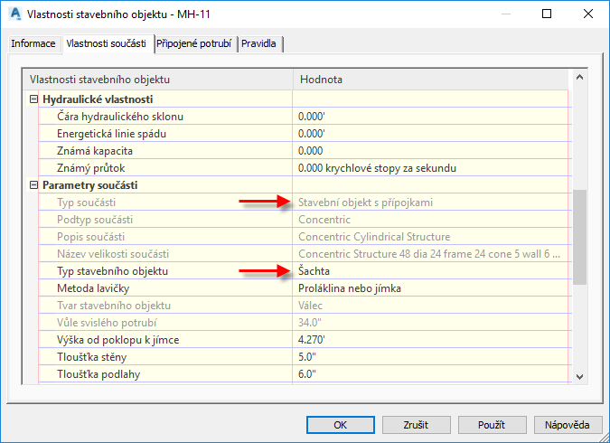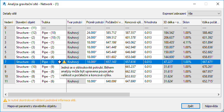 Když namapujete parametry a použijete je u stavebních objektů v existujících potrubních sítích, nebudete muset při použití příkazu Analýza gravitační sítě ručně zadávat hodnoty.