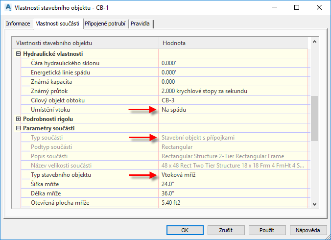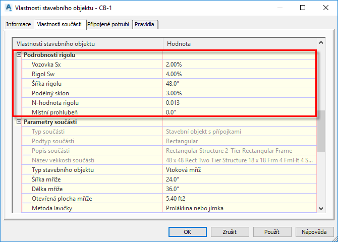 V části Podrobnosti rigolu v dialogu Vlastnosti stavebního objektu můžete definovat vlastnosti plochy vozovky okolo vtoku. Tyto vlastnosti slouží k výpočtům analýzy vtoku u příkazu Analýza gravitační sítě.