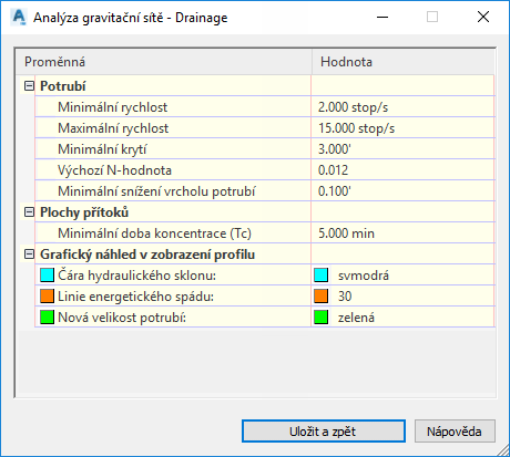 Pomocí příkazu Analýza gravitační sítě můžete změnit velikost potrubí, znovu nastavit dna potrubí a vypočítat linie energetického spádu a čáry hydraulického sklonu podle standardů definovaných v dokumentu HEC-22.