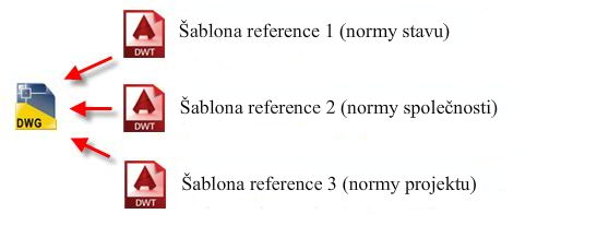K výkresu můžete mít také připojeno více šablon referencí. Uživatelé mohou například vytvořit šablony pro stát, společnost nebo projektové normy: