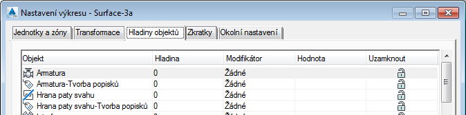 Hladina objektů se definuje v Nastavení výkresu anebo při vytváření. Hladiny komponent jsou definovány ve stylech objektů.