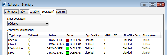 Můžete určit hladiny komponent na kartě Zobrazení <objekt> dialogu Styl. V následujícím příkladu jsou zobrazeny hladiny používané pro komponenty tras: