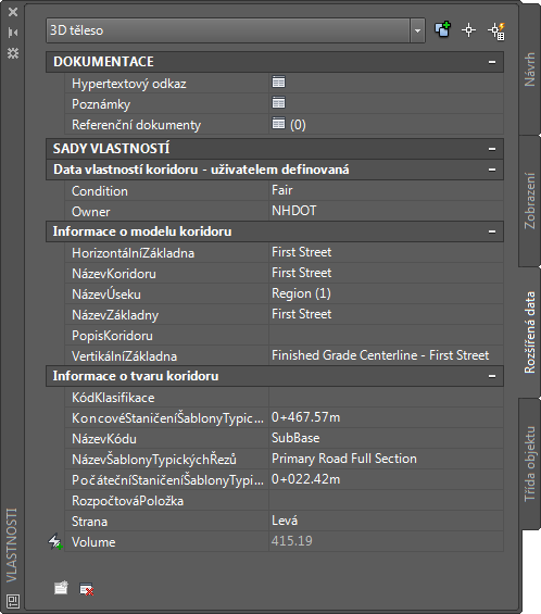 Ve výchozím nastavení jsou v aplikaci Autodesk Civil 3D zahrnuty tři definice sad vlastností, které platí pro koridory i pro 3D objemová tělesa a 3D tělesa: