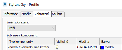 Styly značek slouží k ovládání vzhledu objektů křížení v zobrazeních profilů. Vzhled stylu značek se ovládá pomocí karty Zobrazení dialogu Styl značky. V seznamu Směr zobrazení vyberte profil a prohlédněte si nebo upravte styl značek, který je u zobrazení profilu konfigurován. Zobrazení značky (používané k zobrazení profilů křížení, návrhových linií, polygonů zaměření a 3D křivek) i zobrazení svislé čáry křížení (používané k zobrazení tras křížení) ovládá jediná komponenta.