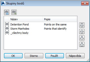 Pořadí zobrazení skupiny bodů pro výkres určuje pořadí, ve kterém jsou skupiny bodů zakresleny při otevření výkresu nebo novém generování obrázků. První (nejvyšší) skupina bodů v seznamu je zakreslena jako poslední.