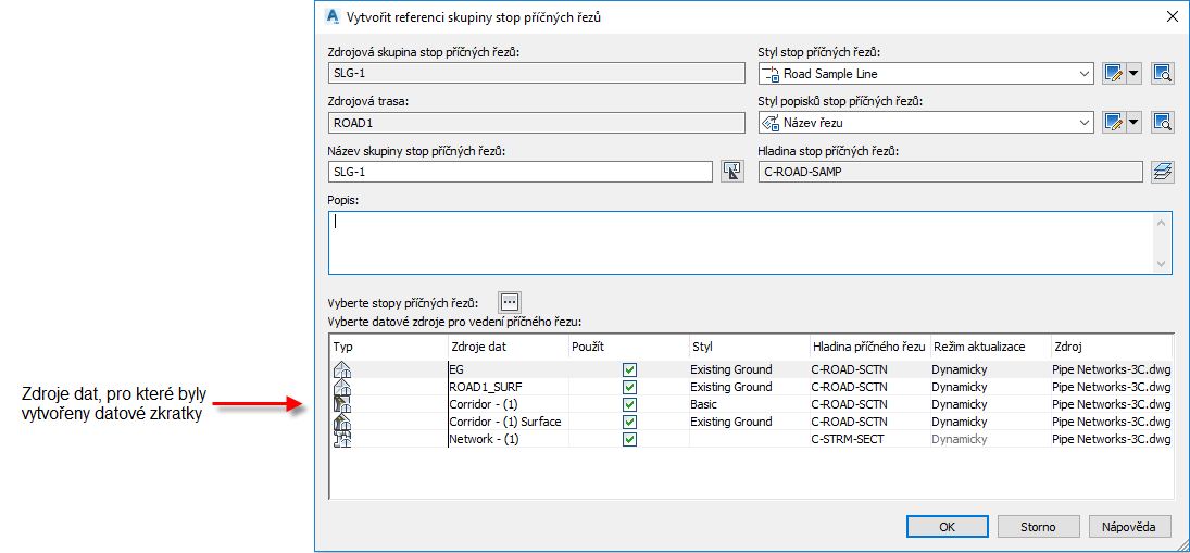 Když vyberete tyto zdroje dat k vedení příčného řezu a kliknete na tlačítko OK, vytvoří se na ně ve výkresu reference (pokud již neexistují). Další informace naleznete v části Datové zkratky a reference skupin stop příčných řezů.