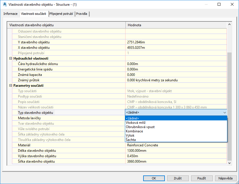 Vlastnost Typ stavebního objektu také určuje, které další vlastnosti budou v dialogu zobrazeny. Pokud například vyberete libovolný typ vtoku, budou zpřístupněny vlastnosti podrobností rigolu a kót vtoku.