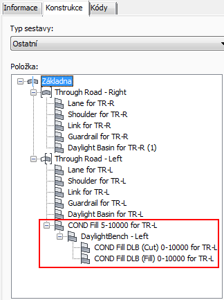 3. V seznamu Položka vyberte podmíněnou šablonu typických řezů, která se nachází na levé straně šablony typických řezů. Opětovným klepnutím zvýrazněte text. Změňte název tak, aby indikoval typ podmínky, na který je nastavena detekce. V následujícím příkladu byl název první podmíněné podsestavy změněn na PODM Násyp 0-5 pro TR-L. V tomto příkladu PODM označuje, že jde o podmíněnou podsestavu. Násyp označuje typ podmínky, která ji aktivuje. 0-5 znamená minimální a maximální hodnotu vzdálenosti, kterou podmínka násypu hledá. V tomto příkladu TR-L představuje referenci na nadřazenou šablonu typických řezů, se kterou je tato konkrétní podsestava asociována (v tomto případě „Through Road” nebo „TR” a „Left side” nebo „L”.)