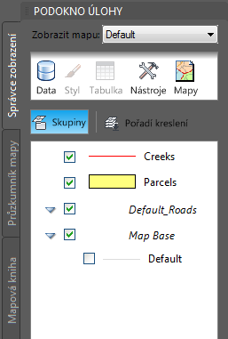 Karta Správce zobrazení zobrazuje hladiny na aktuální mapě.