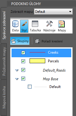 Karta Správce zobrazení zobrazuje hladiny na aktuální mapě.