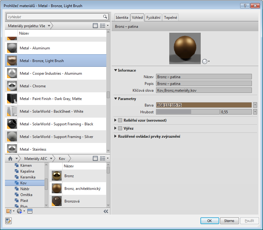 Dialog Prohlížeč materiálů použijte k vyhledání a správě materiálů pro prvky.