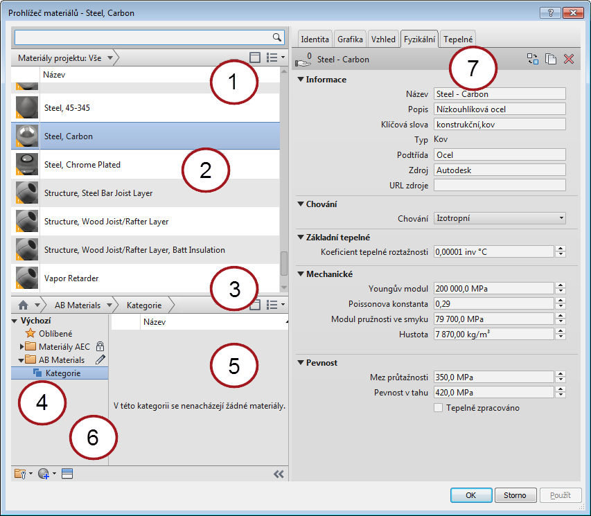 | 7 | Když je materiál vybrán v seznamu knihovny (levé podokno), v pravém podokně se zobrazí karty (položky) asociované s tímto materiálem. Pohled na vlastnosti a položky materiálů zobrazíte kliknutím na karty (například Identita nebo Vzhled). Při zobrazení materiálů v knihovnách jsou vlastnosti určeny pouze ke čtení. |