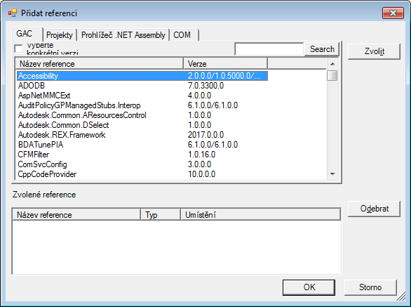 V dialogu Add Reference vyhledejte a vyberte v seznamu položky System.Drawing a System.Windows.Forms. Chcete-li provést vícenásobný výběr, podržte klávesu Ctrl. Příklad: