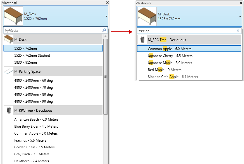 Revit a usnadňuje výběr v seznamu s větším počtem možností. Můžete prohledat následující funkční oblasti: