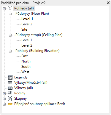 Prohlížeč projektu zobrazuje logickou hierarchii všech pohledů, výkazů, výkresů, rodin, skupin a dalších částí aktuálního projektu. Postupně jak rozbalujete a sbalujete jednotlivé větve zobrazují se položky nižší úrovně.