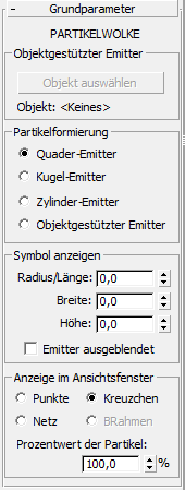 Damit können Sie ein renderfähiges Netzobjekt für die Verwendung als Partikelemitter auswählen. Dieses Objekt wird nur verwendet, wenn die Option "Objektgestützter Emitter" im Bereich "Partikelformierung" gewählt ist.