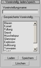 Enthält alle gespeicherten Voreinstellungsnamen. 3ds Max wird mit einer Reihe von Voreinstellungen ausgeliefert. Um die Wirkung dieser Einstellungen zu sehen, erstellen Sie ein Partikelsystem. Laden Sie anschließend eine Voreinstellung, und spielen Sie die gewünschte Animation ab. Einige Voreinstellungen, z. B. "Shimmer Trail" für die Partikelanordnung, sind besonders wirkungsvoll bei sich bewegenden Partikelsystemen.