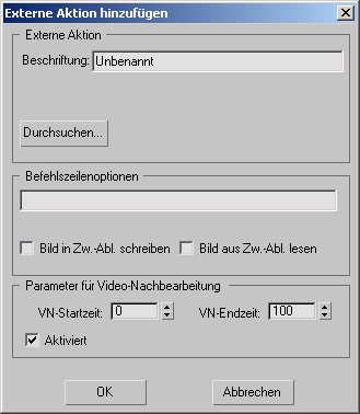 Warnung: Das Bild, das die externe Aktion aus der Zwischenablage liest, wird in der Warteschlange der Video-Nachbearbeitung platziert. Wenn das externe Programm nicht zum gewünschten Ergebnis führt, besteht eventuell die Gefahr, dass Sie das Resultat aller Bearbeitungsschritte in der Video-Nachbearbeitung löschen oder überschreiben.