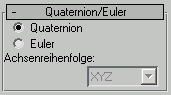 In der Bewegungsgruppe im Rollout "Quaternion/Euler" sehen Sie, dass die Option "Quaternion" standardmmäßig aktiviert ist.