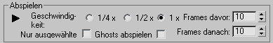 In den Zahlenauswahlfeldern im Bereich "Ghost" können Sie den Quell-Clip und den Ziel-Clip einsehen und weiterspulen, indem Sie Strichmännchen (Ghosts) anzeigen lassen. Das gelbe Strichmännchen stellt den Quell-Clip dar, das rote den Ziel-Clip. Die Bipeds aus beiden Clips sind unter Umständen beim Spulen noch weit voneinander entfernt. Der Ziel-Clip verändert jedoch seine Position, nachdem Sie auf "Start-Frame festlegen" klicken. Wenn ein geeignetes Start-Frame gefunden wurde, klicken Sie auf "Start-Frame festlegen", damit die Werte aus dem Feld "Frame" in das Feld "Start-Frame" übertragen werden. Achten Sie darauf, ob der Status der Fußposition im angegebenen Feld korrekt ist.