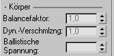 Diese Parameter gelten für den Massenmittelpunkt des Bipeds. Aus ihnen berechnet Character Studio die Bewegungsbahn des Bipeds in der Luft anhand der Schwerkraft ("Schwkr.-Beschl.") und der Zeit zwischen den Schritten, der Beugung der Knie beim Landen ("Ballistische Spannung") und der Weise, in der die Biped-Objekte zusammenspielen, um das Gleichgewicht zu halten ("Balancefaktor").