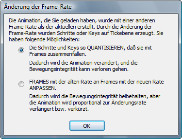 Biped öffnet dieses Dialogfeld, wenn Sie für ein Biped eine BIP-Datei laden, die aus einer Szene gespeichert wurde, deren Frame-Rate von derjenigen der aktuellen Szene abweicht.